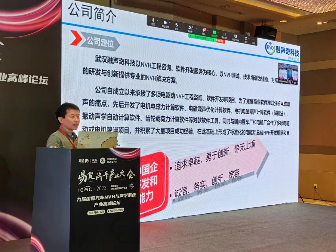 會上,融聲奇科技技術總監張吉健做專題報告《多源激勵下的電驅動總成NVH解決方案及案例分析》,向大家展示了融聲奇科技團隊在NVH研究和聲學領域深耕的成果,公司成立以來,在NVH尤其汽車NVH領域承接了多項NVH工程咨詢項目和軟件開發項目,在這些工程項目實踐的基礎上開發了多款電驅動相關NVH軟件,比如電磁力計算軟件,電磁噪聲優化軟件和總成振動噪聲自動化計算軟件,與很多主機廠或電機長建立了合作關系,積累了大量的成功經驗,在此基礎上形成了標準化的電驅動NVH分析方案和自動化分析流程。