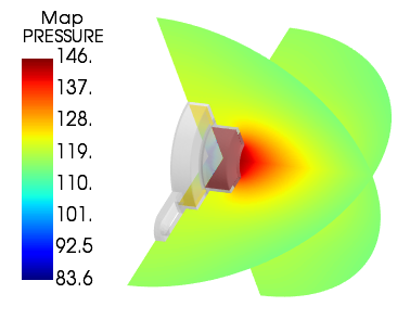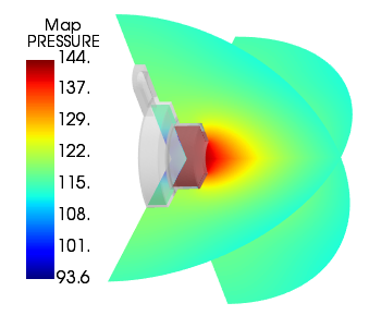 經(jing)過聲(sheng)學頻響分(fen)析設置與求解后(hou),得(de)到聲(sheng)輻(fu)射結果,這里提取蜂鳴器聲(sheng)輻(fu)射云圖如下: